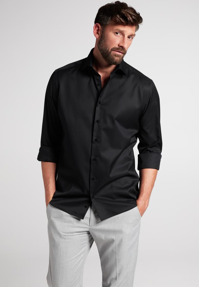 Sporty og elegant på samme tid – uanset hvordan du kombinerer denne ensfarvede herreskjorte (uden brystlomme) – står intet i vejen for et selvsikkert og stilfuldt udseende.