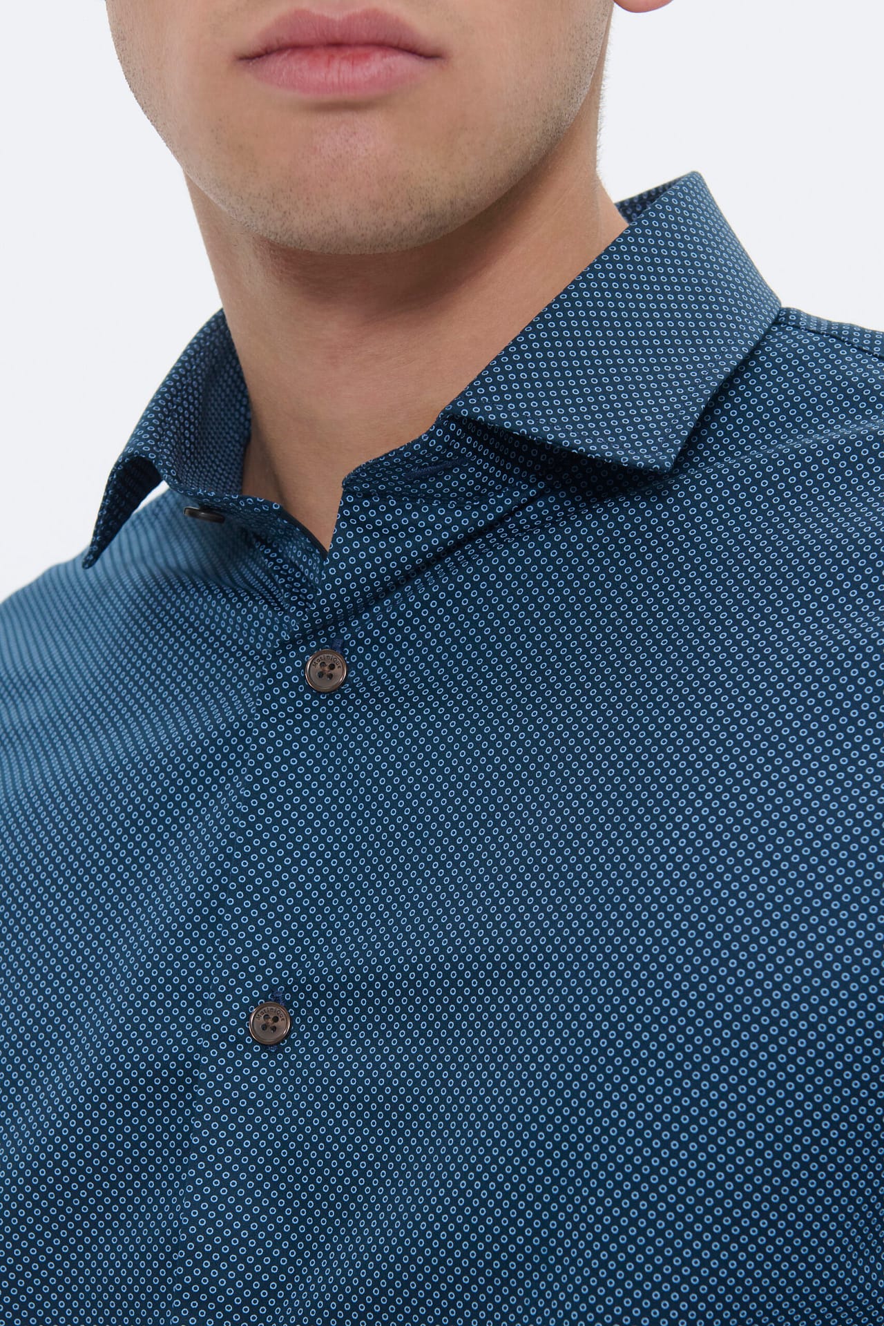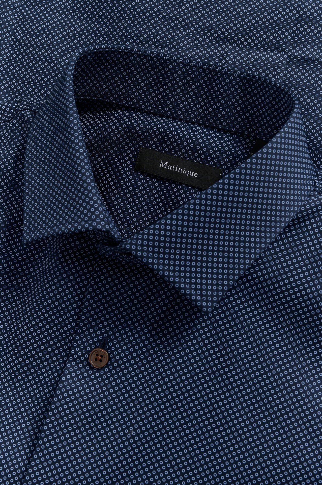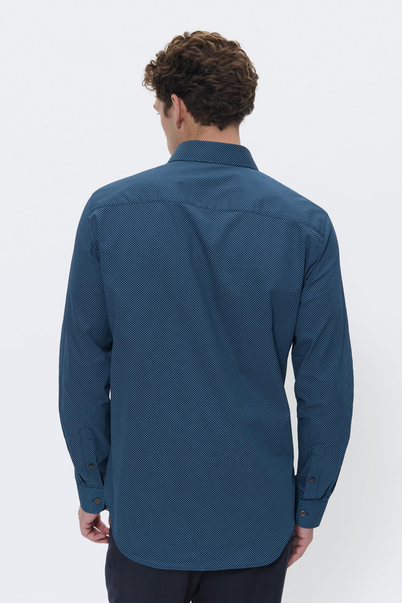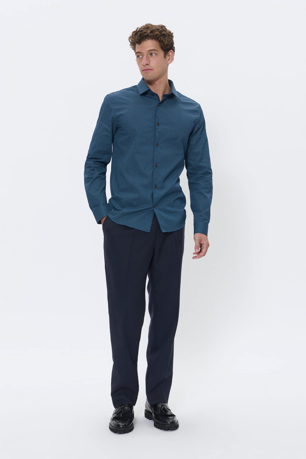 Denne skjorte i slankt snit har et subtilt mikro-mønster, klassisk spids krave og lange ærmer med manchetter. Buet kant skaber et skarpt udtryk.